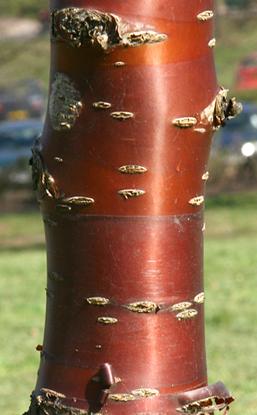 10′ A small tree that is outstanding for mahogany coloured surface of the main trunk and branches. Small white flowers in the Spring but it is the polished brilliance and shine of the bark that is such a special feature, especially as it shines in the Winter sun.